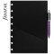 Stílusos, fekete színű betét Filofax Notebook-hoz, elasztikus tolltartóval és zsebbel ellátva. Szintén a termék tartozéka egy színes, fekete tintával író toll.