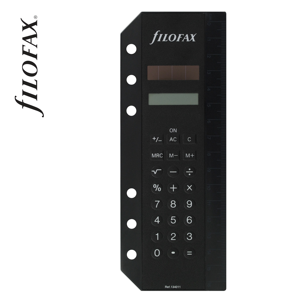 Vonalzóval ellátott, napelemes, Filofaxba lefűzhető számológép.