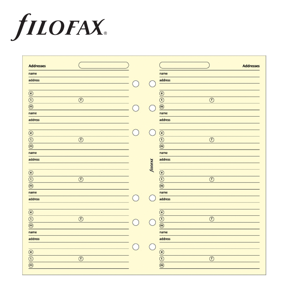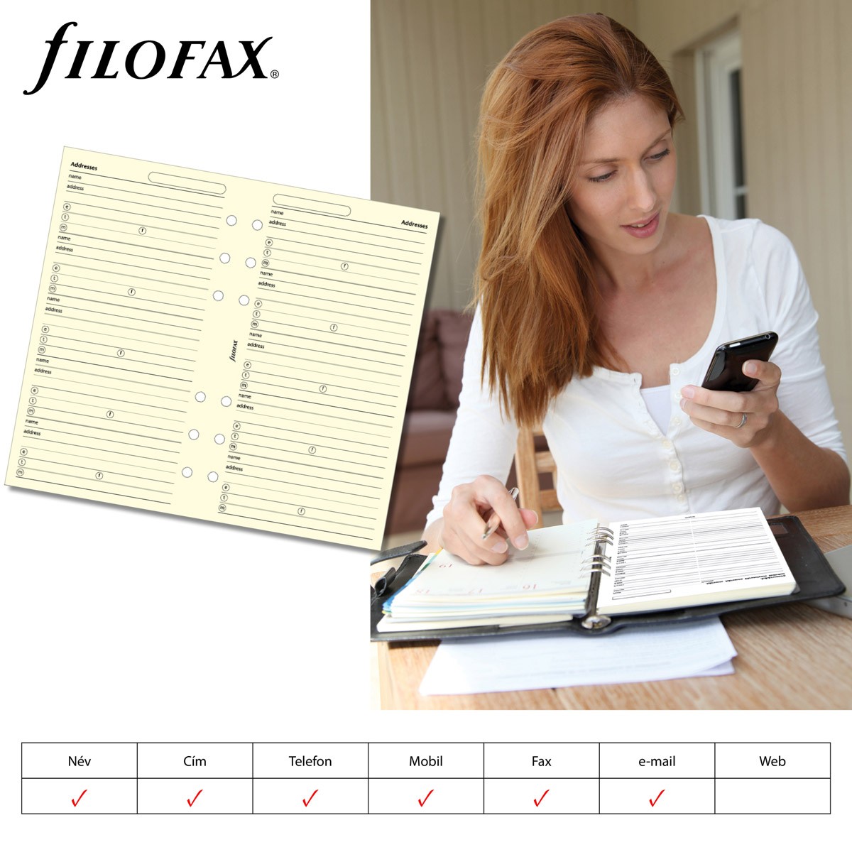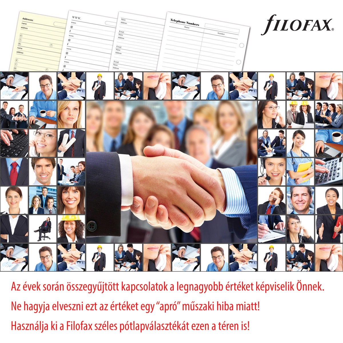 Az évek során összegyűjtött kapcsolatok a legnagyobb értéket képviselik Önnek. Ne hagyja elveszni ezt az értéket egy “apró” műszaki hiba miatt! Használja ki a Filofax széles pótlapválasztékát ezen a téren is! Kontakt lista (nevek, telefonszámok, címek, e-mail címek) számos változatban, minden mérethez.