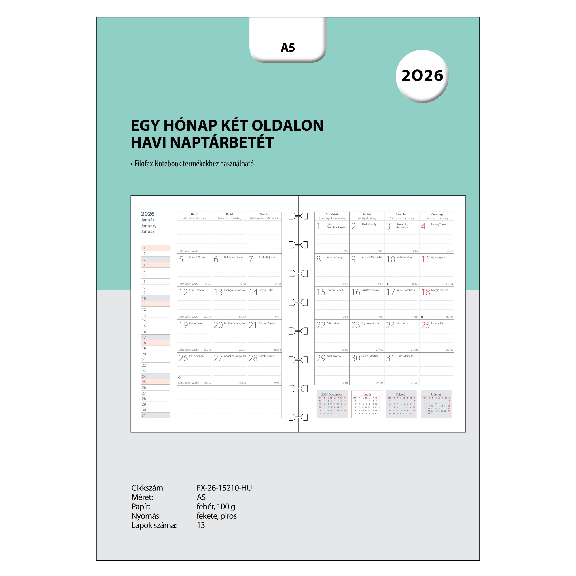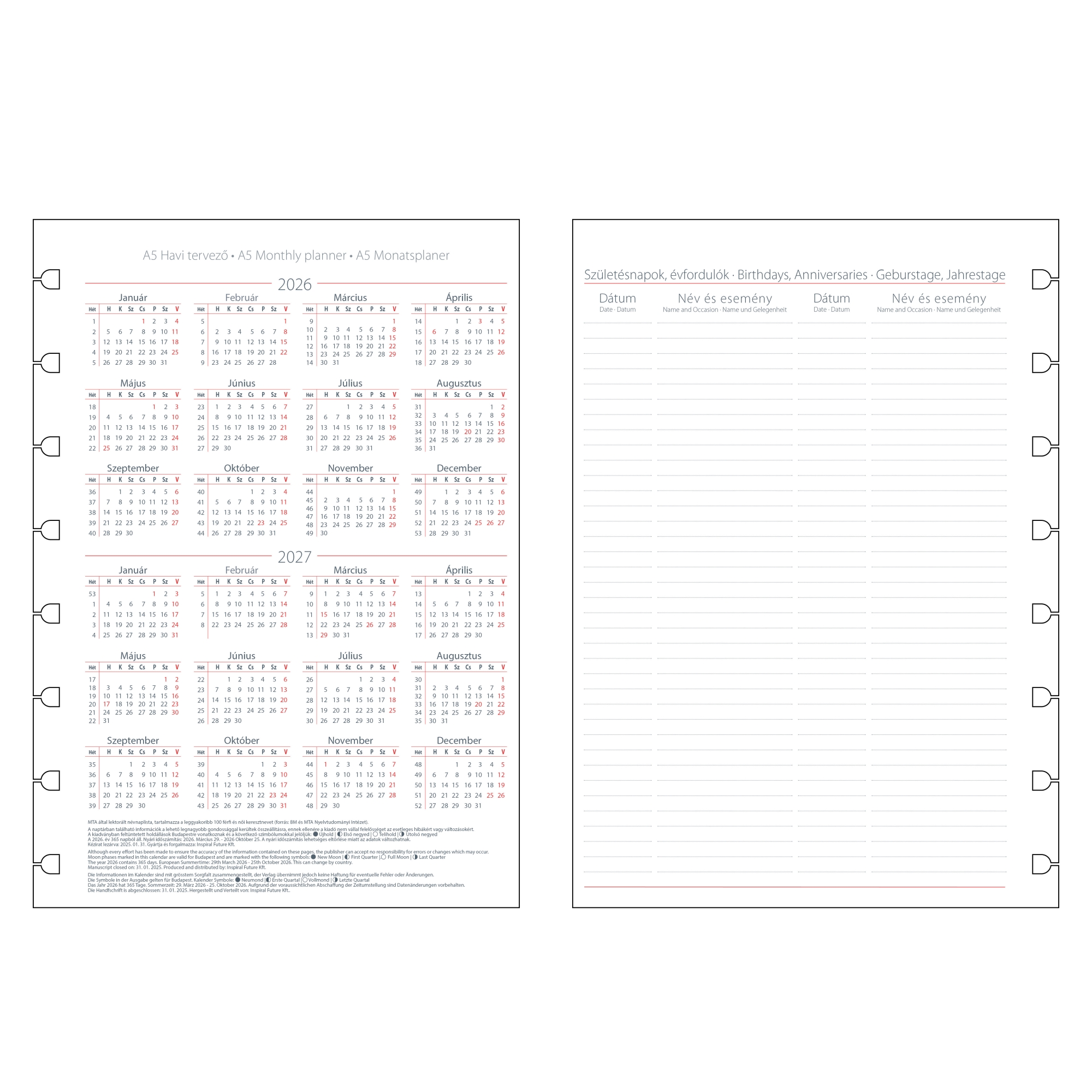 Gyűrűs kalendárium naptárbetét, 1 hónap 2 oldalon beosztással. 2026. és 2027. évi összesített naptárral, születésnap és évforduló tervezó, valamint éves tervek és célok rögzítésére használható oldallal. A5 méretű Notebook termékekben használható.